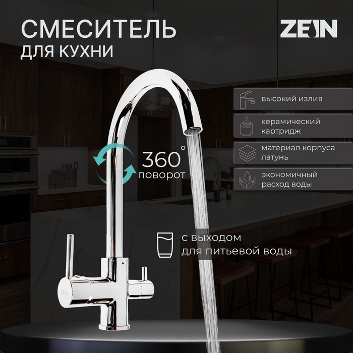 УЦЕНКА Смеситель для кухни ZEIN ZC-011, с выходом для питьевой воды, латунь, хром