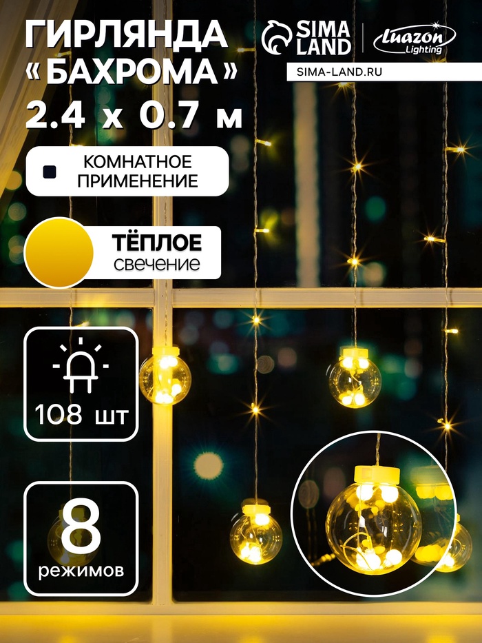 УЦЕНКА Гирлянда «Бахрома» 2.4×0.7 м с насадками «Шарики», IP20, прозрачная нить, 108 LED, свечение тёплое белое, 8 режимов, 220 В