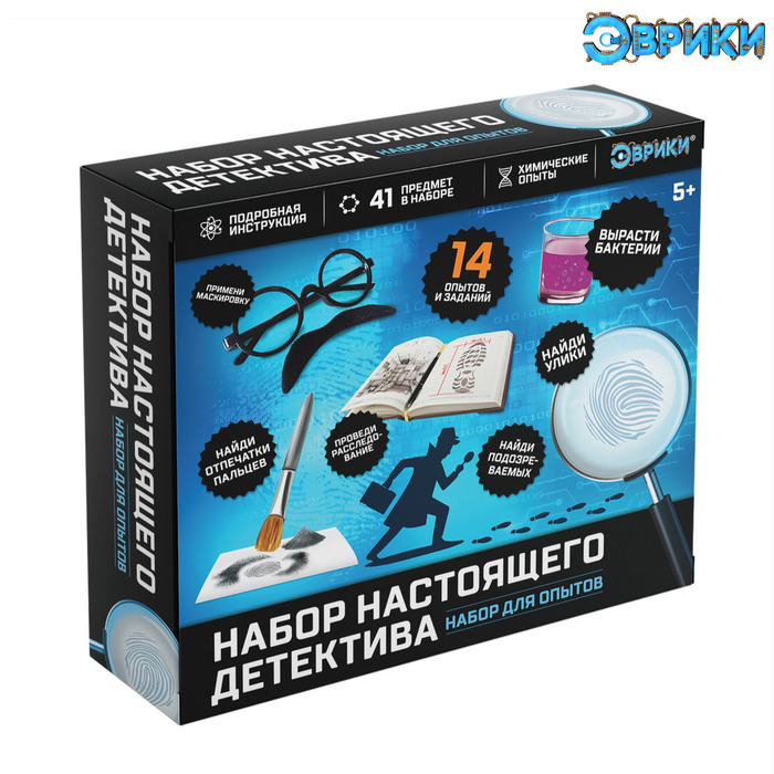С увлекательным набором для опытов ребёнок почувствует себя настоящим детективом, научится быть более внимательным и сможет сам попробовать раскрыть преступление.