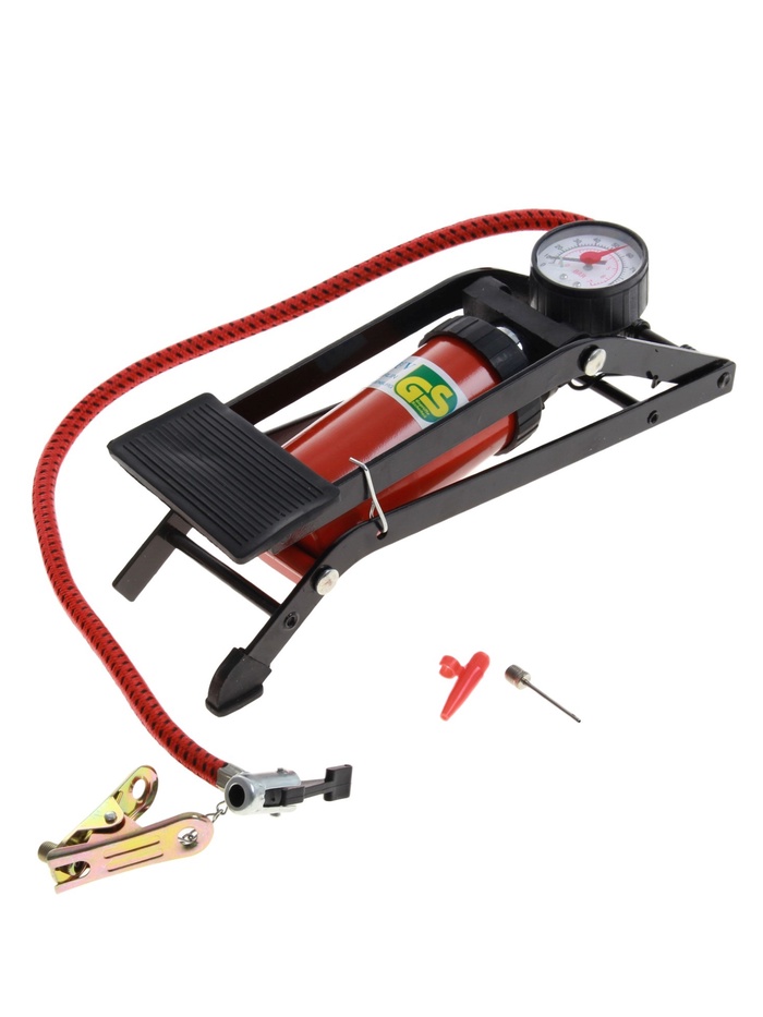 Ножной насос применяется для накачивания шин автомобилей, мотоциклов и велосипедов, а также надувных детских игрушек, матрасов, спортивных мячей и других подобных изделий. Насос оснащён манометром для измерения давления воздуха. Для удобства пользователя педаль насоса имеет специальную рельефную противоскользящую накладку.