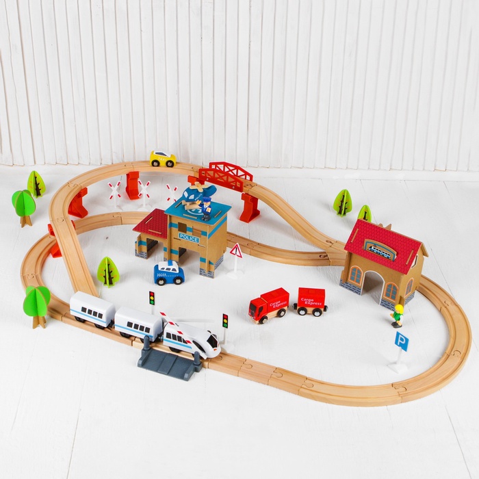 Деревянная железная дорога с вертолётной площадкой — это увлекательный набор из 88 элементов для создания многоуровневых маршрутов. В комплекте современный поезд с тремя вагонами, легковая машинка, грузовик, мост и переезд. Набор подходит для детей от 3 лет и работает от одной батарейки типа AA.