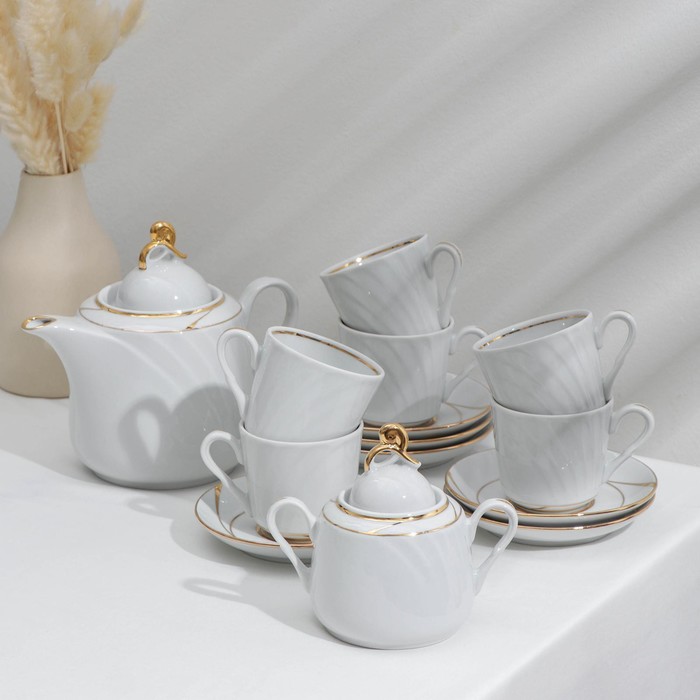 Чайный сервиз с золотой отводкой на 6 персон — это фарфоровый набор для тех случаев, когда хочется подать чай красиво, спокойно и без случайных деталей. Белая основа, рельефная фактура и тонкий золотой акцент создают собранную, нарядную сервировку, которая уместна и для домашних встреч, и для приёма гостей. Такой комплект хорошо подходит для чаепитий, где важны не только напитки, но и общее впечатление от стола.